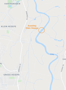 In Klein Hesepe können wir dich und das saubere Boot wieder einsammeln. Auf der linken Emsuferseite findest du einen kleinen Anleger vor dem nächsten großen Wehr. Hier kannst du deine Tagestour beenden.